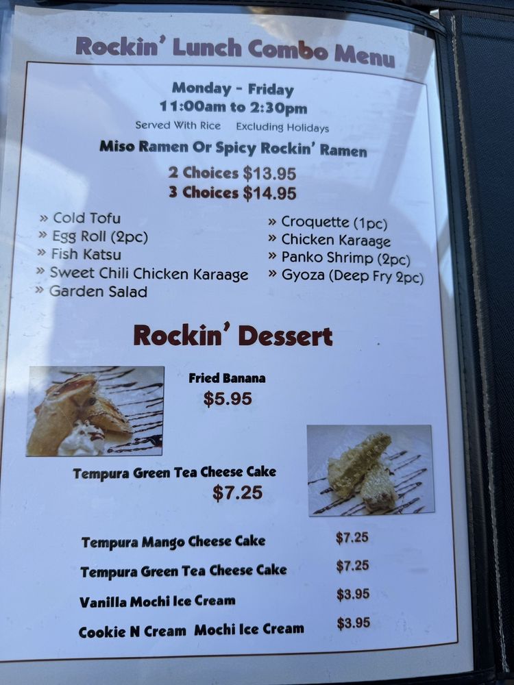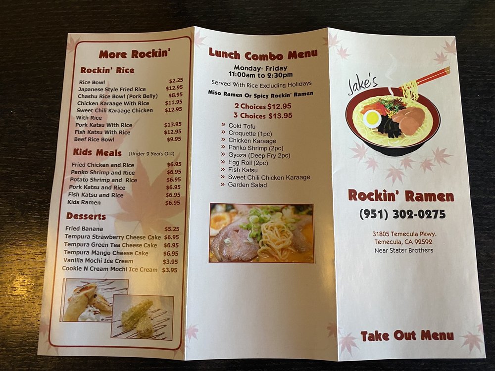 Rockin’ Ramen in Temecula, CA offers a diverse menu with a variety of appetizers, rice dishes, and, of course, their specialty ramen dishes. The Black Garlic Ramen, Cheese Ramen, and Chicken Ramen are highlights, each featuring unique ingredients like chashu, seasoned egg, sweet corn, seaweed, and more. The Vegetarian Options and Soy-Free Options cater to different dietary preferences, making it inclusive for all customers. The casual atmosphere, wheelchair accessibility, and ample parking add to the convenience of dining here. The restaurant also offers takeout, delivery, and catering services, making it a versatile option for any occasion. The menu is reasonably priced, making it a great choice for families, groups, or solo diners looking to enjoy a delicious bowl of ramen. Overall, Rockin’ Ramen offers a fulfilling dining experience with a wide range of options to satisfy every palate.